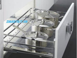 Giá để xoong nồi bát đĩa tủ dưới là một giải pháp lý tưởng để tối ưu cho không gian bếp. Theo đó, phụ kiện nhà bếp được thiết kế lắp đặt bên trong tủ sử dụng ray giảm chấn có sức chứa lớn sẽ giúp cho gia chủ giải quyết lượng lớn xoong nồi, bát đĩa trong một cách nhanh chóng.
