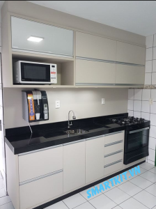 – Phối hợp vật dụng: Màu tủ bếp Laminate chủ đạo là màu xám, nên tận dụng điều này ta có thể trang trí thêm các bòng đèn loại nhỏ với ánh sáng vàng phân bố theo những khoảng cách đều nhau đối với loại bếp có cố định trên tường, tạo nên một không gian nhà bếp lung linh và ấm cúng hơn. Mặt bàn màu trắng nên ta có thể để lên đó các lọ hoa, hay các giỏ trái cây, sẽ giúp làm nổi bật những thứ đó, làm cho căn phòng thêm sinh động hơn. Chiều cao bàn được thiết kế ngang thắt lưng, nên chúng ta có thể trang bị thêm những bộ ghế ngồi, để giúp người trong gia đình hoặc khách đến chơi vừa xem vừa ngồi thưởng thức các món ăn.